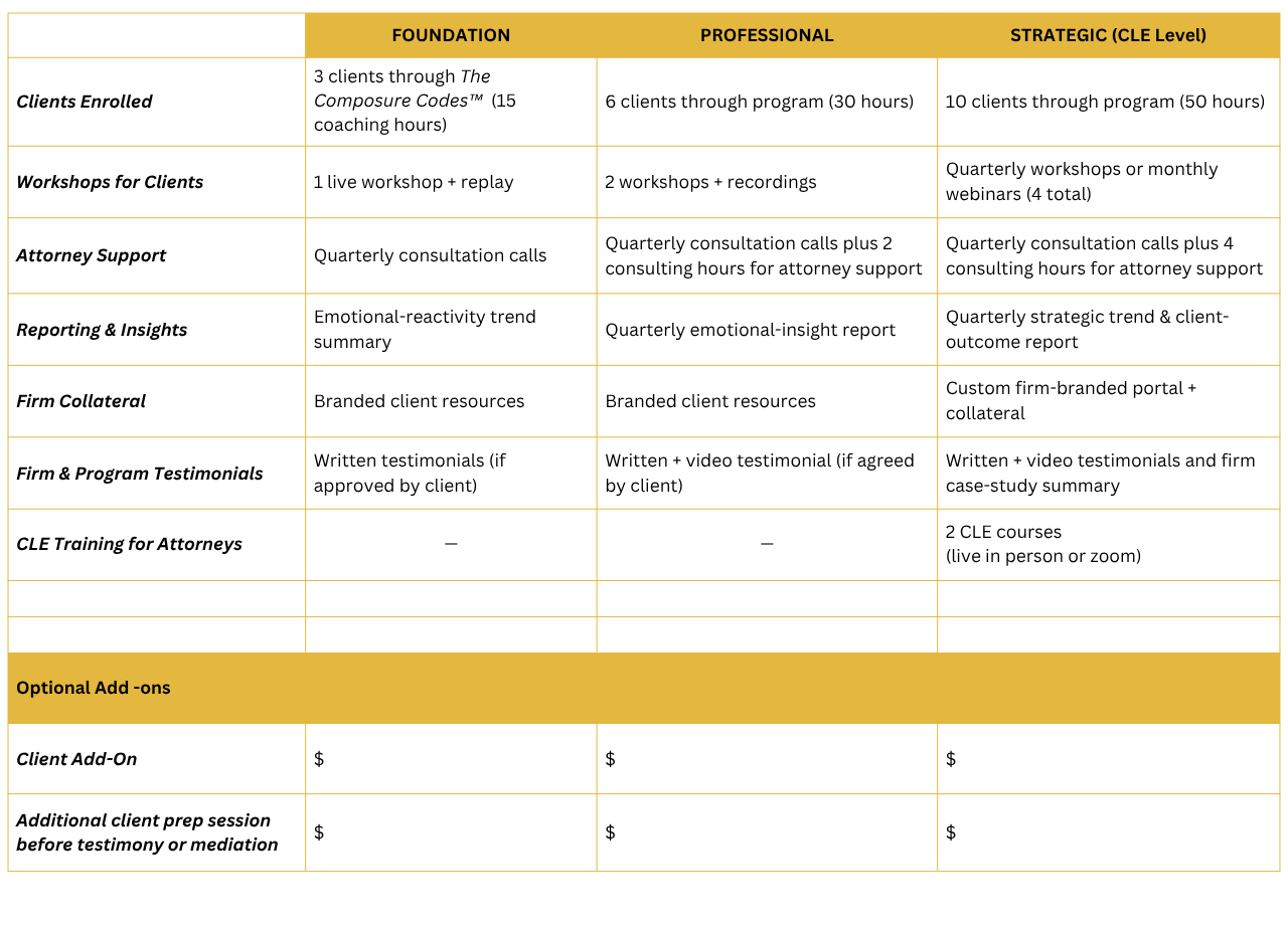 Each partnership tier builds upon the same foundation: client composure, attorney support, and strategic emotional-reactivity insights.